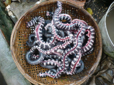 Có lẽ, trong các loại rắn thì rắn trun là loại dễ làm nhất. Nồi nước nấu làm rắn không cần phải thật sôi, đem đổ nước sôi vào xô đựng rắn và để như vậy chừng năm phút thì trút rắn ra thau - lúc này rắn đã chết, lớp “da lụa” đã tróc ra từng mảng. Đổ nước vào thau đựng rắn, lấy lá sả vuột cho tróc hết lớp “da lụa”, rồi dùng dao bén mổ bụng, bộ đồ lòng rắn trun chỉ lấy gan, phổi và tim.