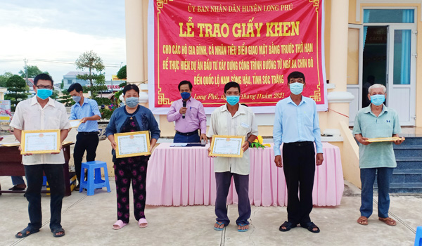 Chiều ngày 25/11, Hội đồng bồi thường hỗ trợ và tái định cư Dự án đầu tư xây dựng công trình đường từ ngã ba Chín Đô đến Quốc lộ Nam sông Hậu huyện Long Phú tổ chức buổi lễ trao giấy khen của Chủ tịch UBND huyện cho các hộ gia đình, cá nhân tiêu biểu trong giao mặt bằng trước thời hạn để thực hiện dự án.