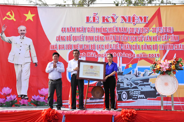 Chiều ngày 26/4, Thị ủy, HĐND, UBND, Ủy ban MTTQ Việt Nam thị xã Vĩnh Châu tổ chức lễ kỷ niệm 44 năm Ngày giải phóng miền Nam thống nhất đất nước (30/4/1975-30/4/2019), kỷ niệm 133 năm Ngày Quốc tế Lao động (01/5/1886 - 01/5/2019) và đón nhận Bằng xếp hạng Di tích lịch sử văn hóa cấp tỉnh đối với Nhà bia lưu niệm Chi bộ Lạc Hòa - tiền thân của Đảng bộ thị xã Vĩnh Châu. Dự lễ có đồng chí Nguyễn Thanh Bình - nguyên Bí thư Tỉnh ủy; đại diện lãnh đạo Sở Văn hóa, Thể thao và Du lịch; lãnh đạo Thị ủy, HĐND, UBND, Ủy ban MTTQ thị xã; lực lượng vũ trang; đoàn viên, thanh niên và nhân dân xã Vĩnh Hải, xã Lạc Hòa.