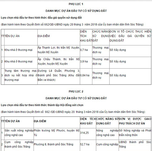 2. Danh mục dự án có sử dụng đất cần lựa chọn nhà đầu tư năm 2018 trên địa bàn tỉnh Sóc Trăng: Xem chi tiết tại phụ lục đính kèm.
