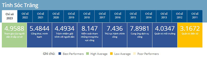 Theo kết quả công bố Chỉ số PAPI năm 2023, tỉnh Sóc Trăng đạt 45,61 điểm, thuộc nhóm Cao nhất. So với năm 2022 tăng 2,76 điểm, xếp hạng 04/61 tỉnh, thành phố trong cả nước (tăng 20 bậc), xếp thứ nhất các tỉnh khu vực đồng bằng sông Cửu Long.