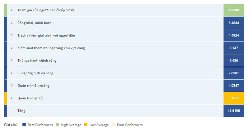 Chỉ số PAPI năm 2023 của tỉnh có sự gia tăng vượt bậc so với năm 2022, tất cả 08 chỉ số nội dung đều tăng điểm số, tăng thứ hạng và tăng nhóm xếp hạng. Đặc biệt có 06 chỉ số nội dung thuộc nhóm Cao nhất (công khai, minh bạch; trách nhiệm giải trình với người dân; kiểm soát tham nhũng trong khu vực công; thủ tục hành chính công; cung ứng dịch vụ công và quản trị môi trường); 01 chỉ số nội dung xếp hạng  nhất là kiểm soát tham nhũng trong khu vực công.