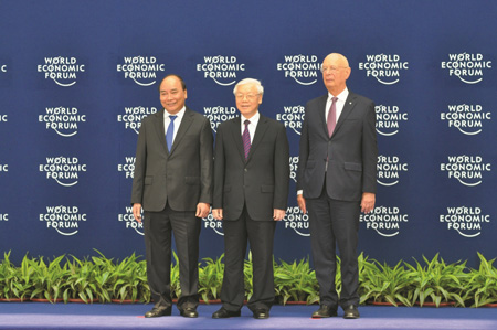 Tổng Bí thư Nguyễn Phú Trọng, Thủ tướng Nguyễn Xuân Phúc và Chủ tịch WEF Klaus Schwab khai mạc Diễn đàn.