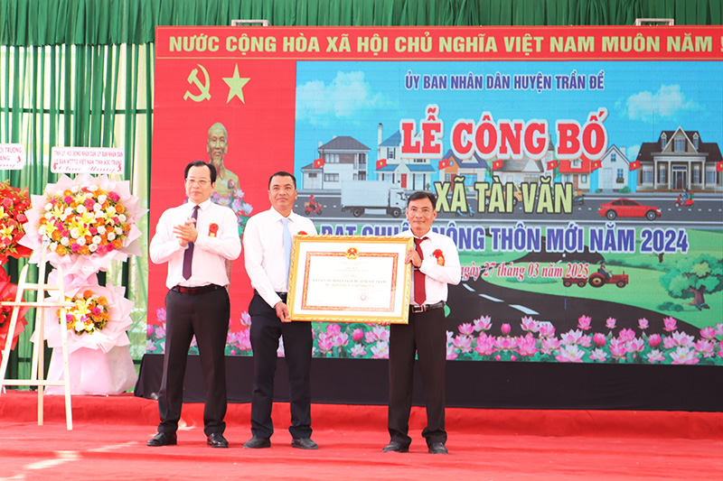 Ngày 27/3/2025, tại xã Tài Văn, huyện Trần Đề (Sóc Trăng), UBND huyện Trần Đề tổ chức Lễ công bố Quyết định của Chủ tịch UBND tỉnh công nhận xã Tài Văn đạt chuẩn xã nông thôn mới. Tham dự có đồng chí Vương Quốc Nam - Tỉnh ủy viên, Phó Chủ tịch UBND tỉnh; đồng chí Lưu Hữu Danh - Tỉnh ủy viên, Bí thư Huyện ủy Trần Đề; đồng chí Khưu Đăng Phượng - Phó Bí thư Thường trực Huyện ủy; đồng chí Nguyễn Trọng Sơn - Chủ tịch UBND huyện Trần Đề; lãnh đạo các sở, ban ngành liên quan; lãnh các phòng, ban chuyên môn huyện Trần Đề.