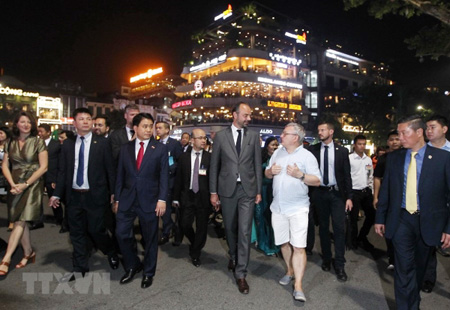 Thủ tướng Pháp Édouard Philippe nói chuyện với du khách tại khu vực phố đi bộ hồ Hoàn Kiếm. (Ảnh: Lâm Khánh/TTXVN)