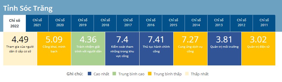 Qua đánh giá, Chỉ số PAPI năm 2022 của tỉnh có sự gia tăng đáng kể về điểm, thứ hạng và nhóm xếp hạng so với năm 2021, có 06/08 chỉ số nội dung tăng điểm (Tham gia của người dân ở cấp cơ sở; Công khai, minh bạch; Trách nhiệm giải trình với người dân; Kiểm soát tham nhũng trong khu vực công; Quản trị môi trường; Quản trị điện tử). Trong 08 chỉ số nội dung, tỉnh Sóc Trăng có 03 chỉ số nội dung lọt vào nhóm Cao nhất (Thủ tục hành chính công, Kiểm soát tham nhũng trong khu vực công và Quản trị môi trường).